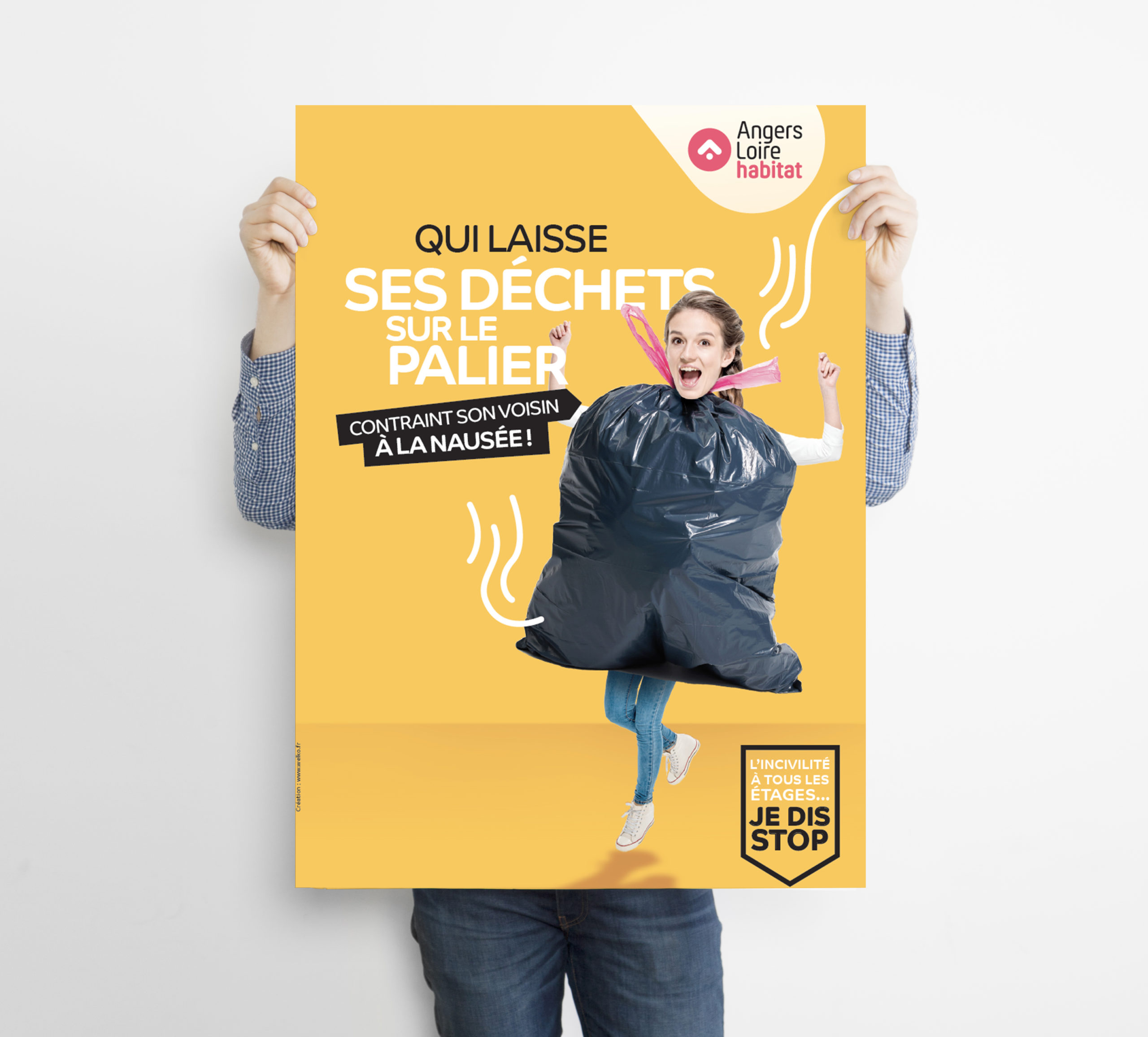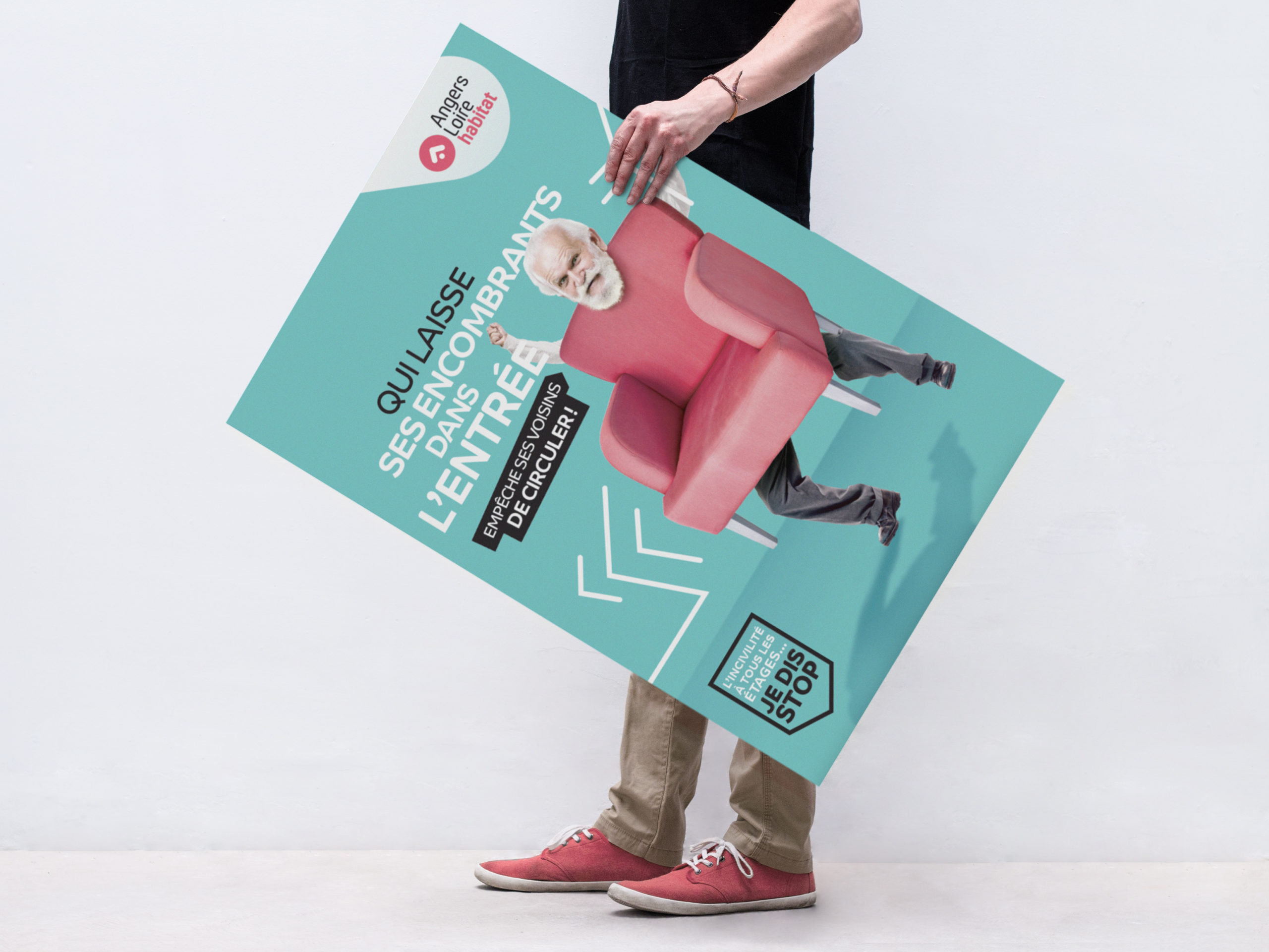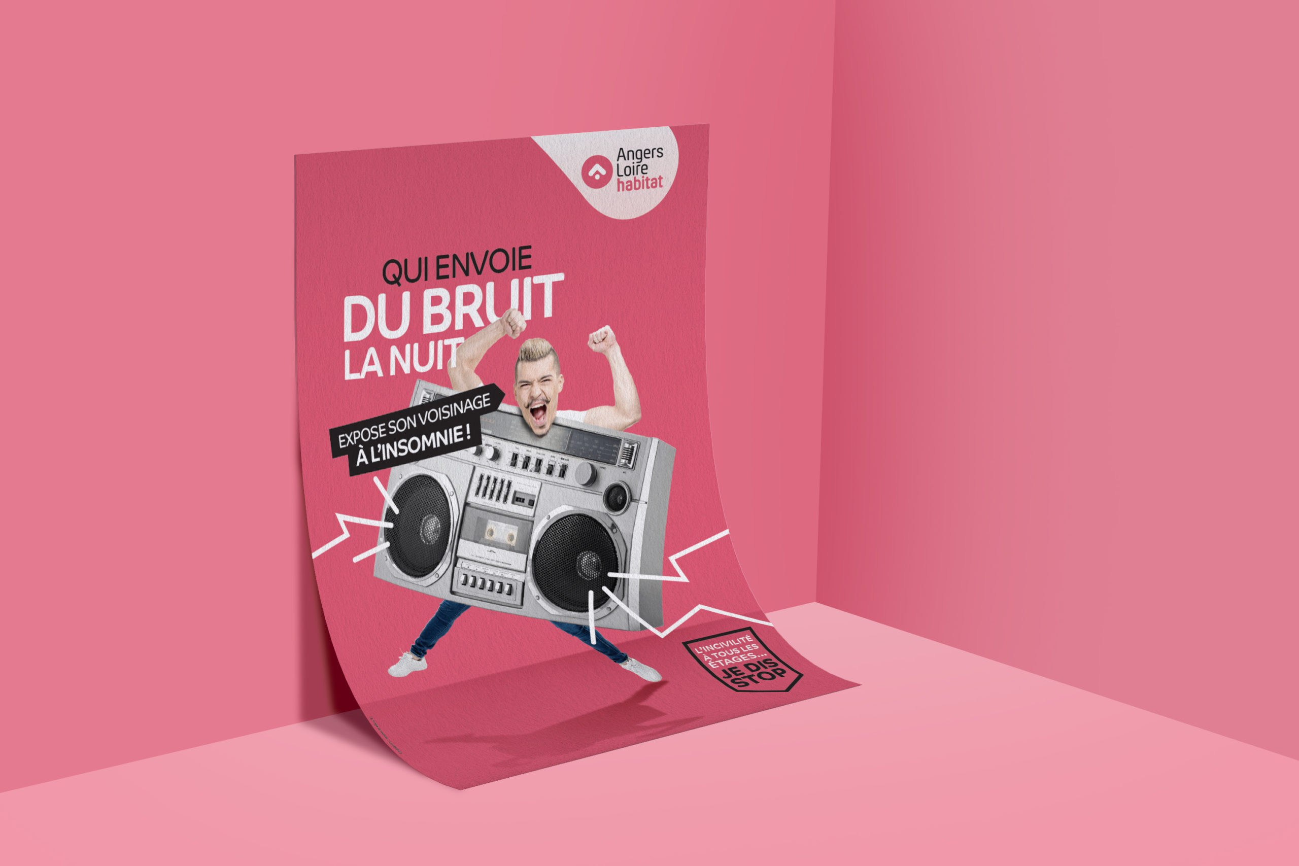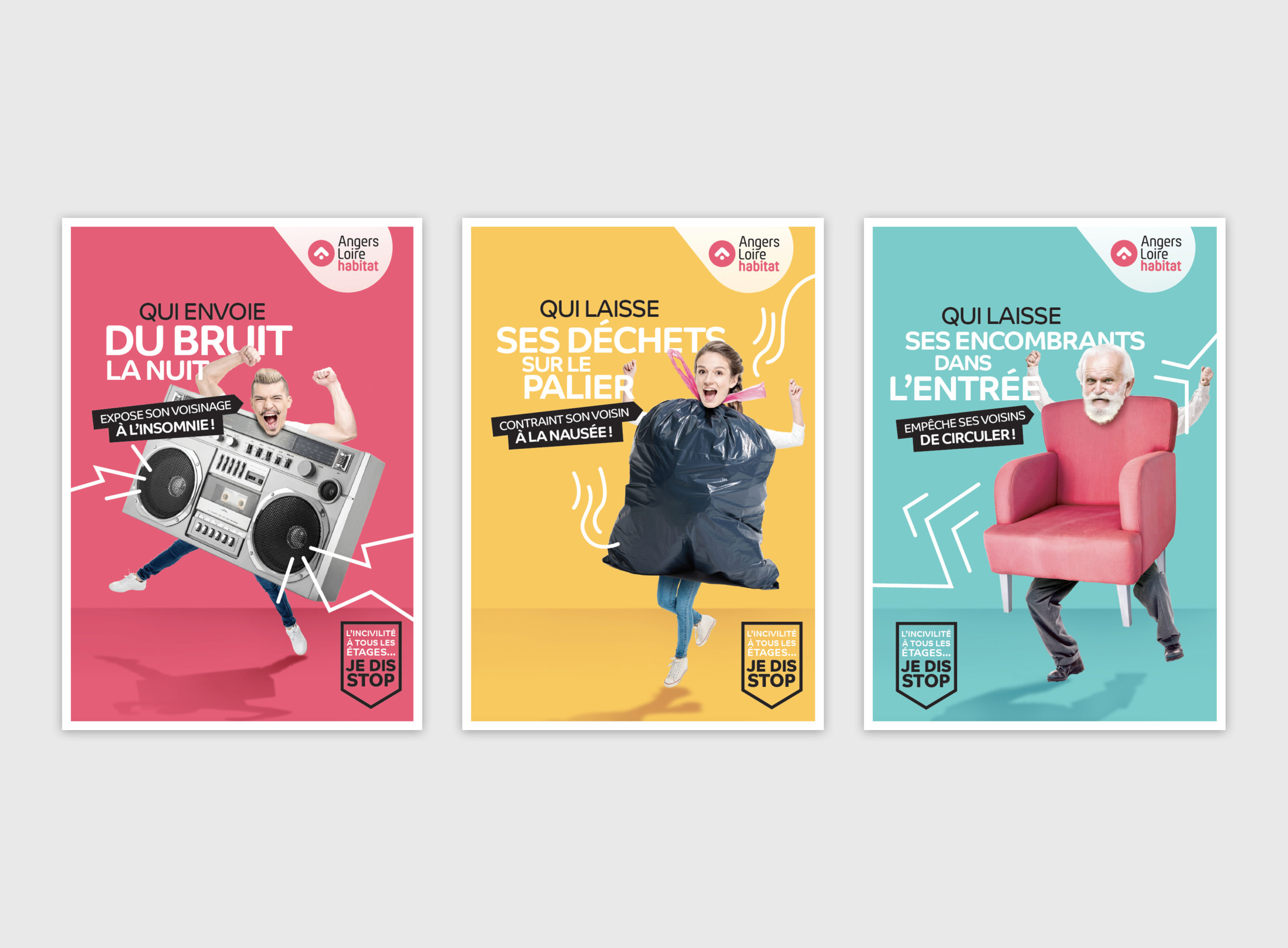 Office Public de l’Habitat angevin, Angers Loire Habitat nous a passé commande d’une campagne pour lutter contre les incivilités au sein de son parc immobilier. Nous avons fait le choix d’un ton léger et non moralisateur pour illustrer trois types d’incivilité : la nuisance sonore, la gestion des déchets et des encombrants. La signature « L’incivilité à tous les étages, je dis stop » incite chaque habitant à contrôler son comportement.