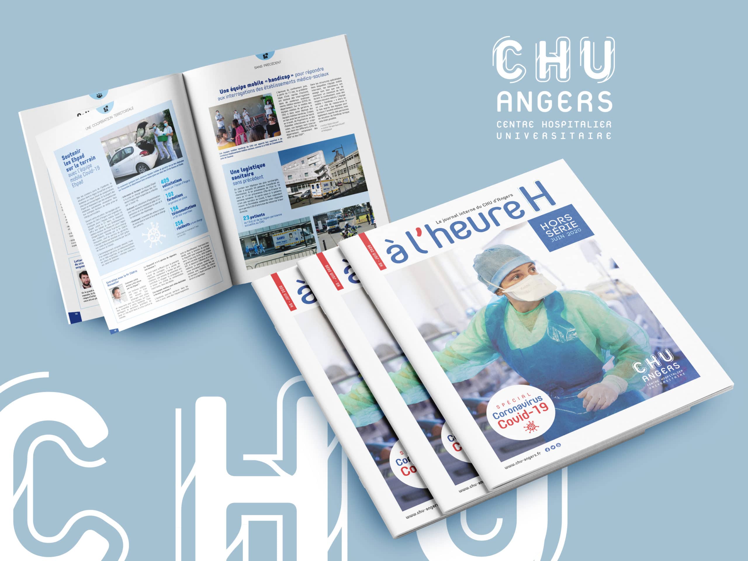 L’agence est fière d’avoir accompagné le CHU Angers dans la création de leur hors-série spécial Covid19 du magazine interne A l’Heure H.