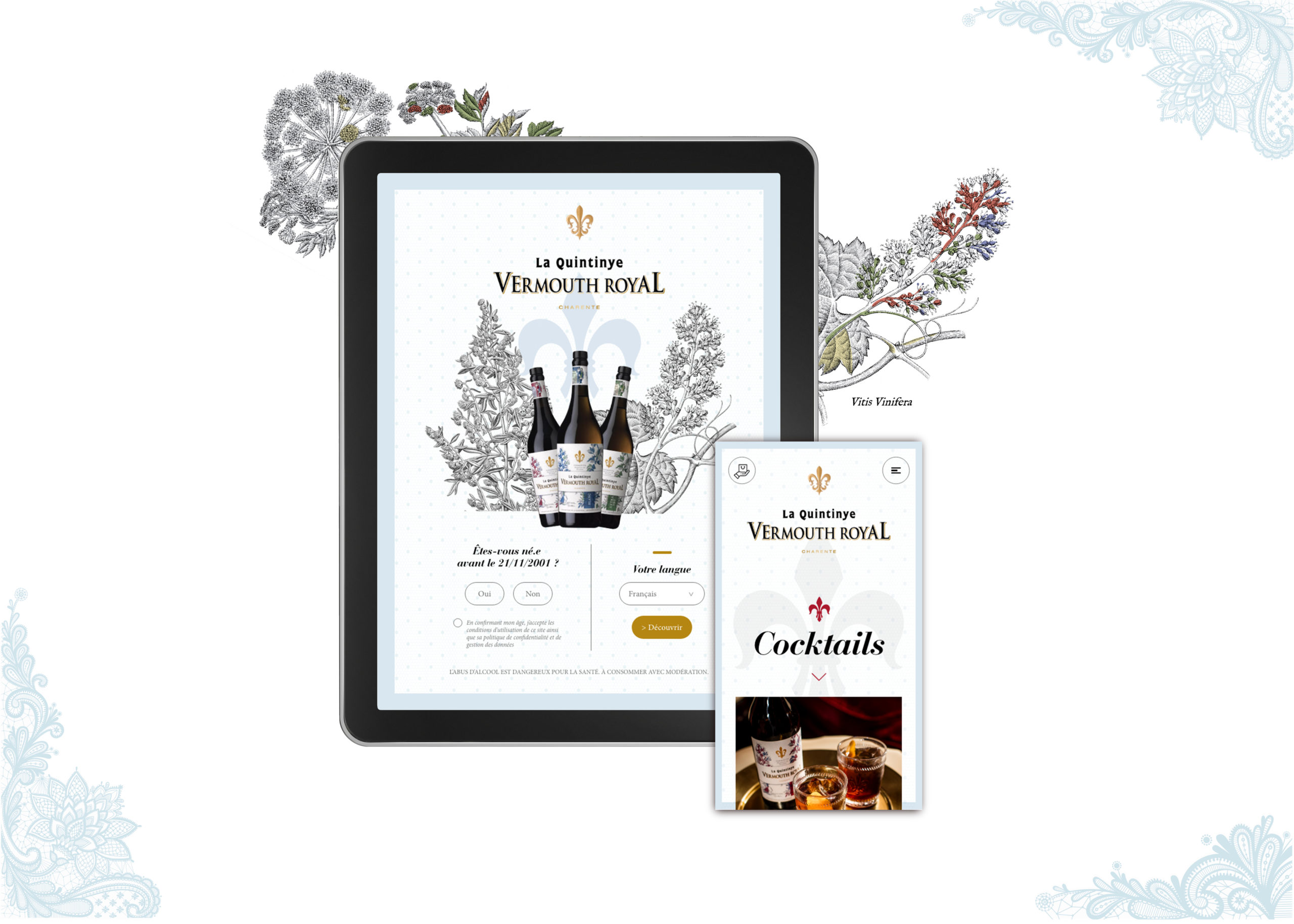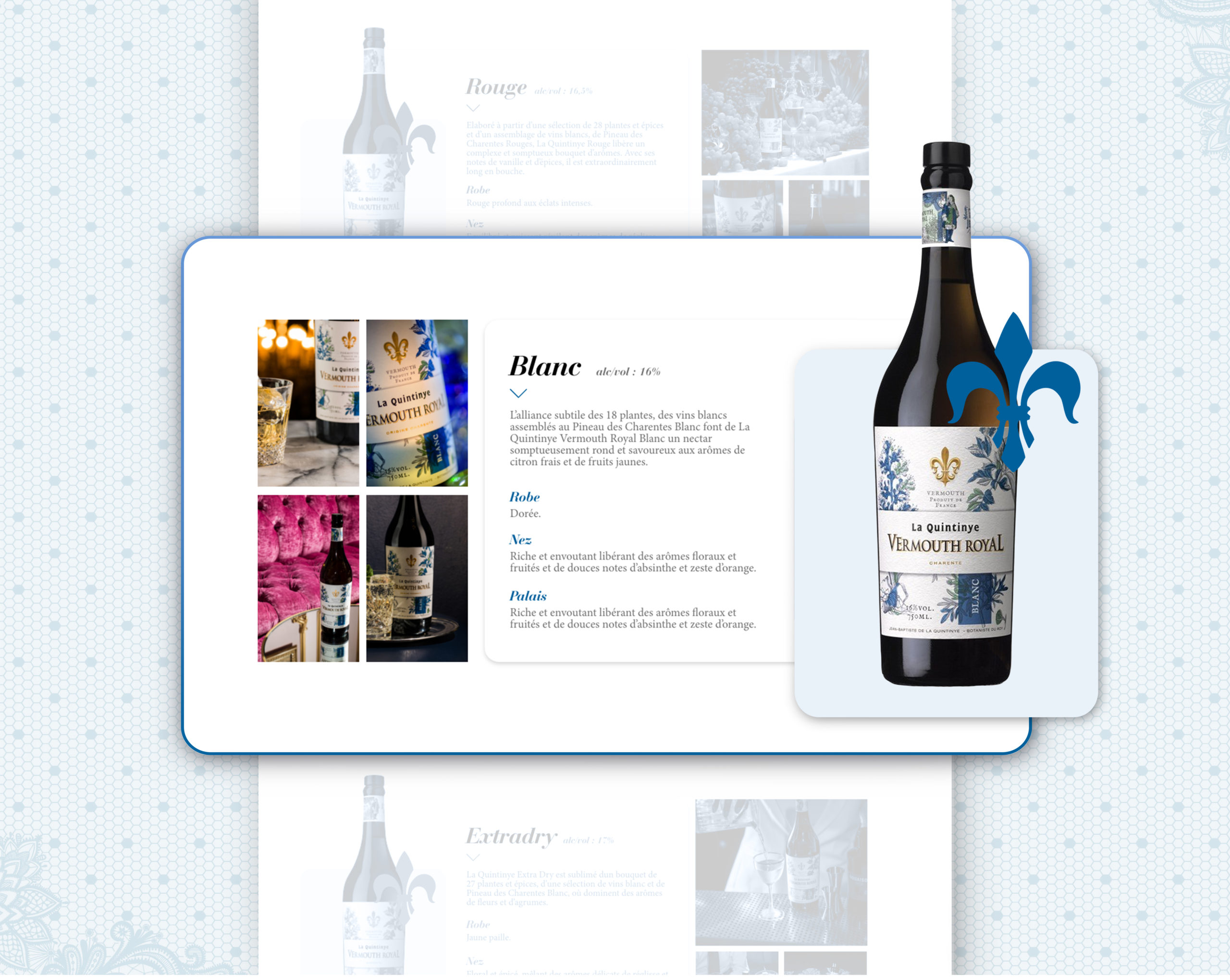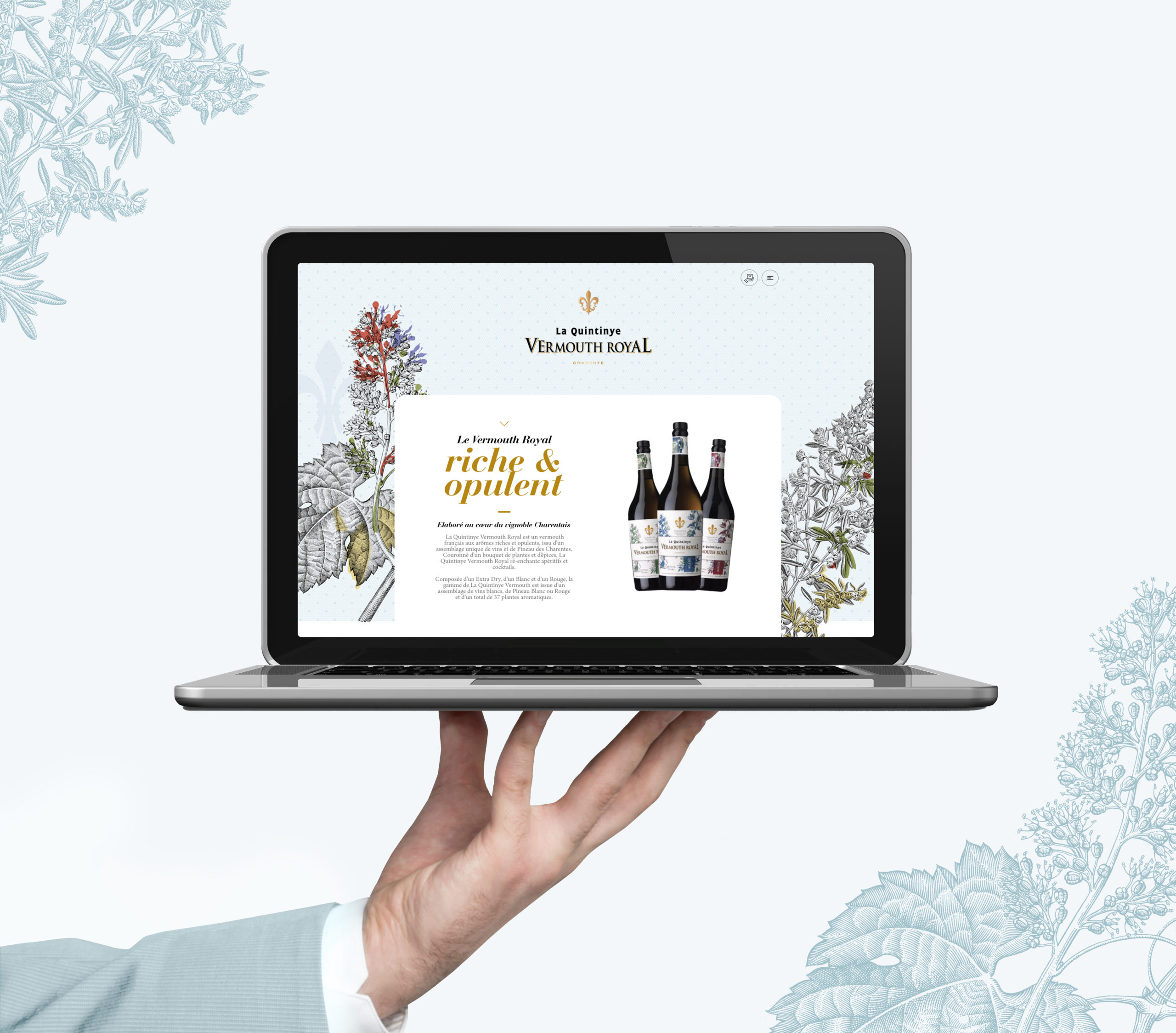 La Quintinye Vermouth Royal est un apéritif issu d’assemblage de vin, de Pineau des Charentes et de bouquets de plantes et d’épices. Il tient son nom de Jean Baptiste De La Quintinye, Botaniste du Roi Soleil. Nous avons avons réalisé le design et le développement du site web de ce produit d’exception.