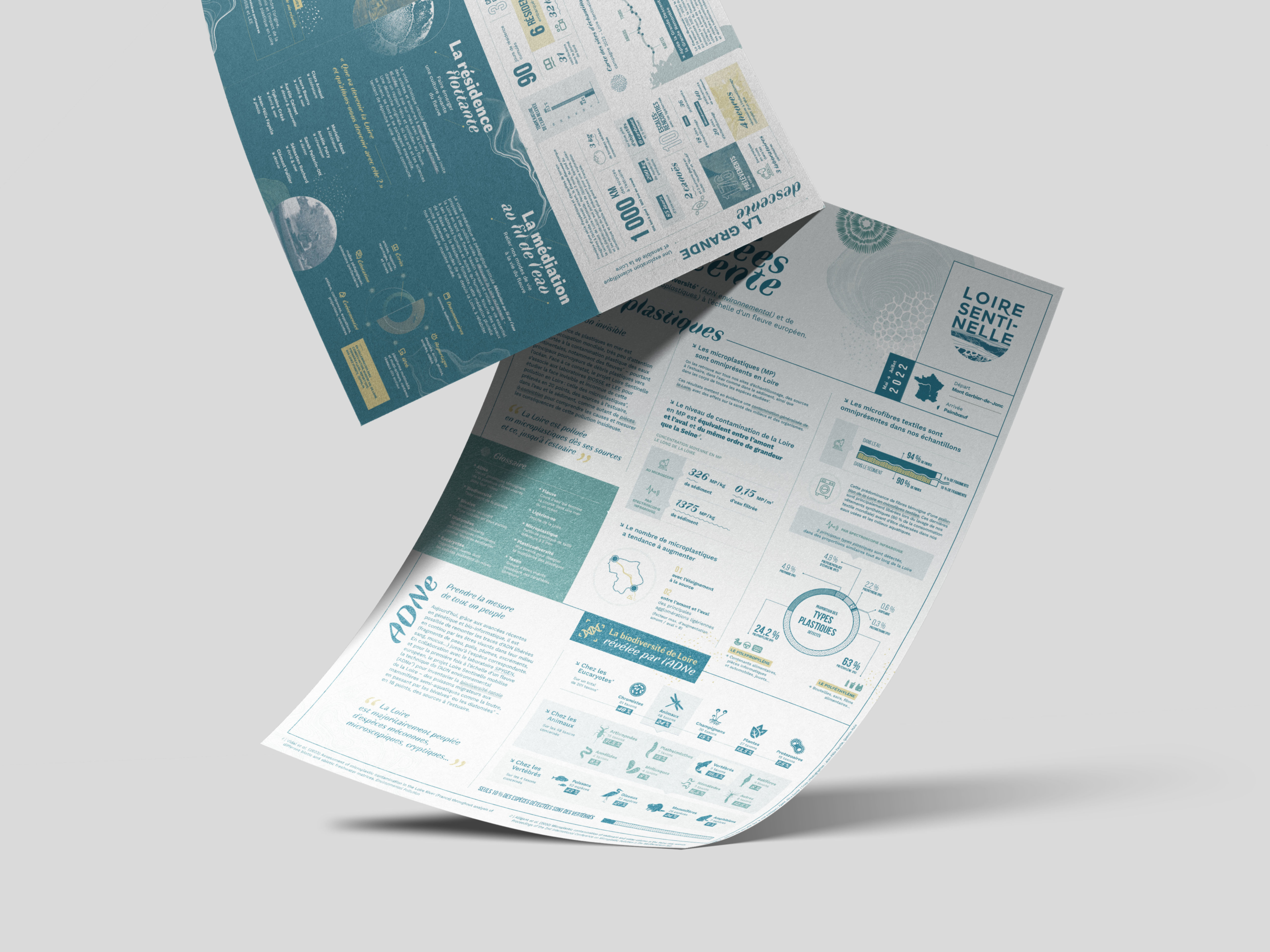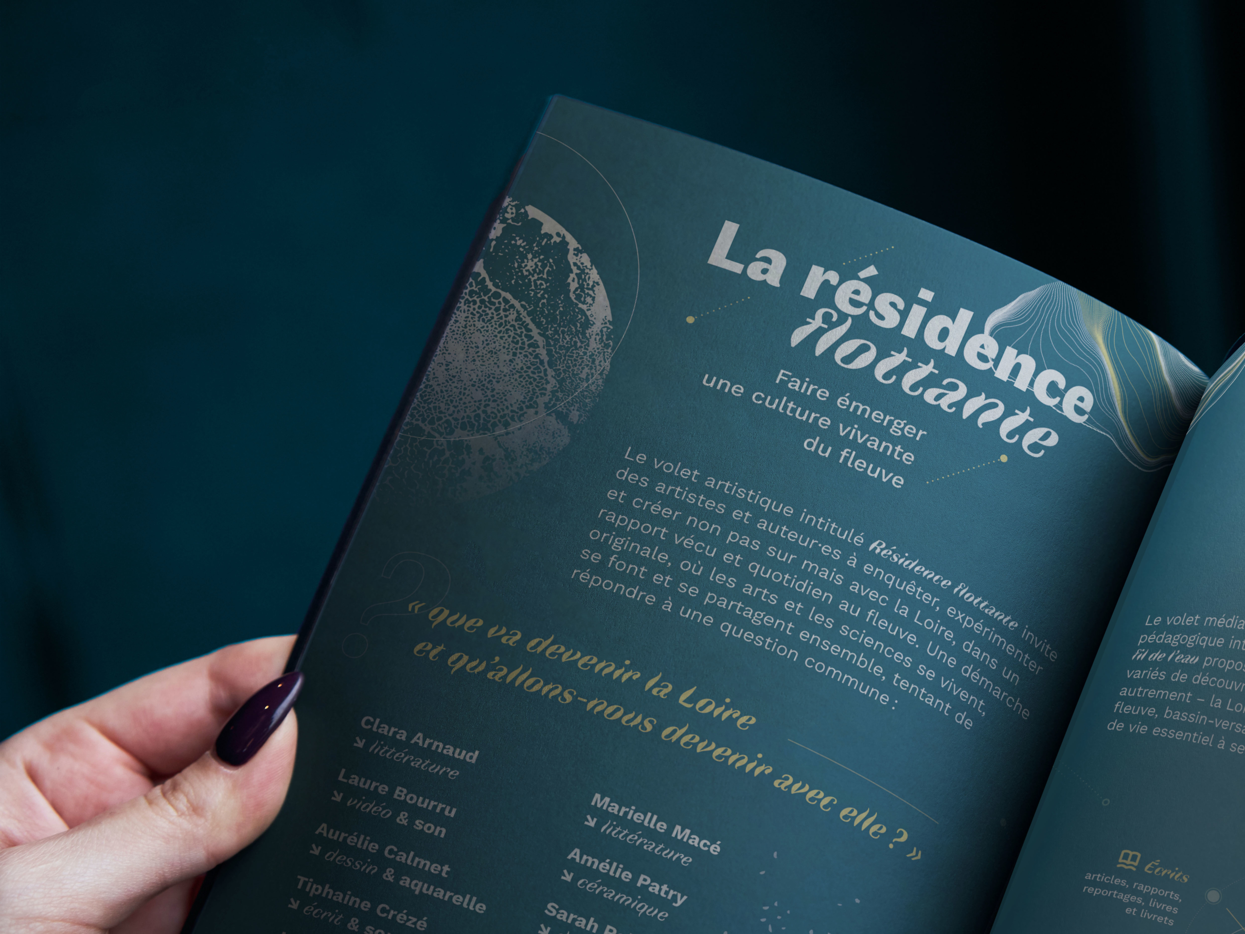 Le support, majoritairement blanc, laisse une large place au papier. Le bleu profond qui l’accompagne rappelle les eaux de la Loire. Des éléments graphiques, lesquels évoquent les sédiments, les micro-organismes ou bien encore les végétaux, habillent ce livret. Ils symbolisent la cartographie du vivant.